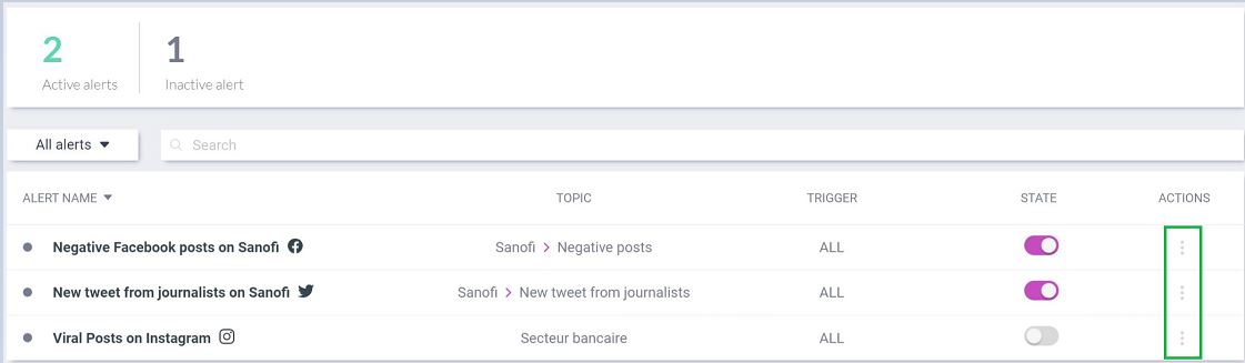 This tab enables you to access all Alerts (active and inactive) created on your account. When the "State" is turned off (in grey) the Alert is inactive.&#x20;