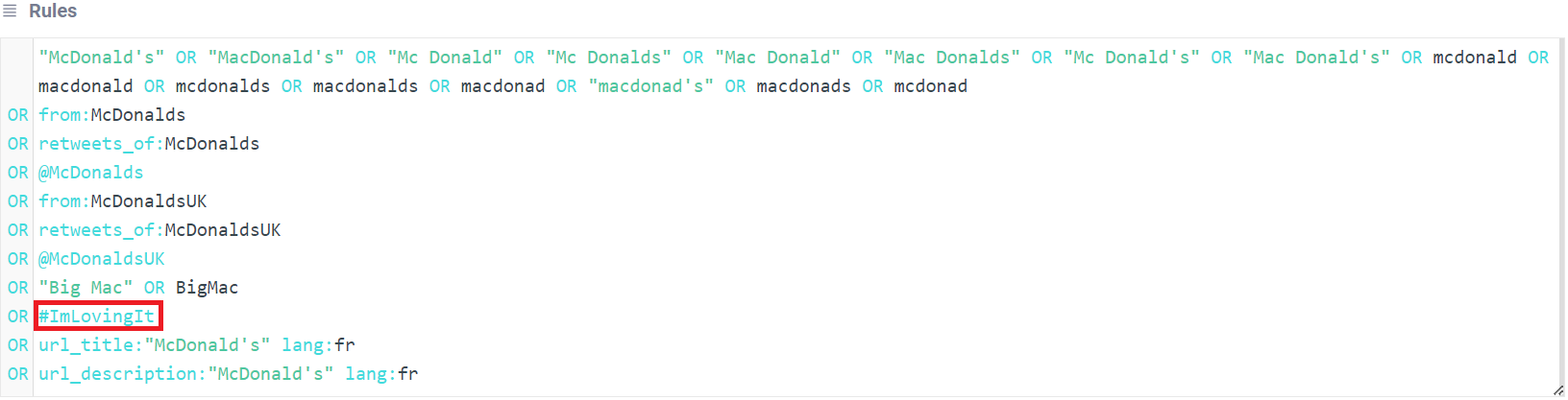 Finally, we recommend you to add every hashtags associated to the brand. They can be created by the brand itself (#ImLovingIt) or can be created by another person (for example, a hashtag like #BoycottMcDonalds). This kind of hashtags should be systematically added to the Topic to avoid missing any post using it.