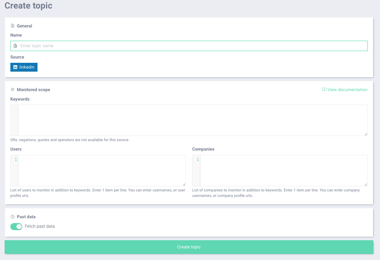 We recommend building your monitoring request as large as possible and using our [filtering system](https://help.visibrain.com/~/revisions/Sg0jEnRI9hg61KE4OFRP/useful-documents/list-of-operators-to-add-filters/linkedin) once the data's collected.